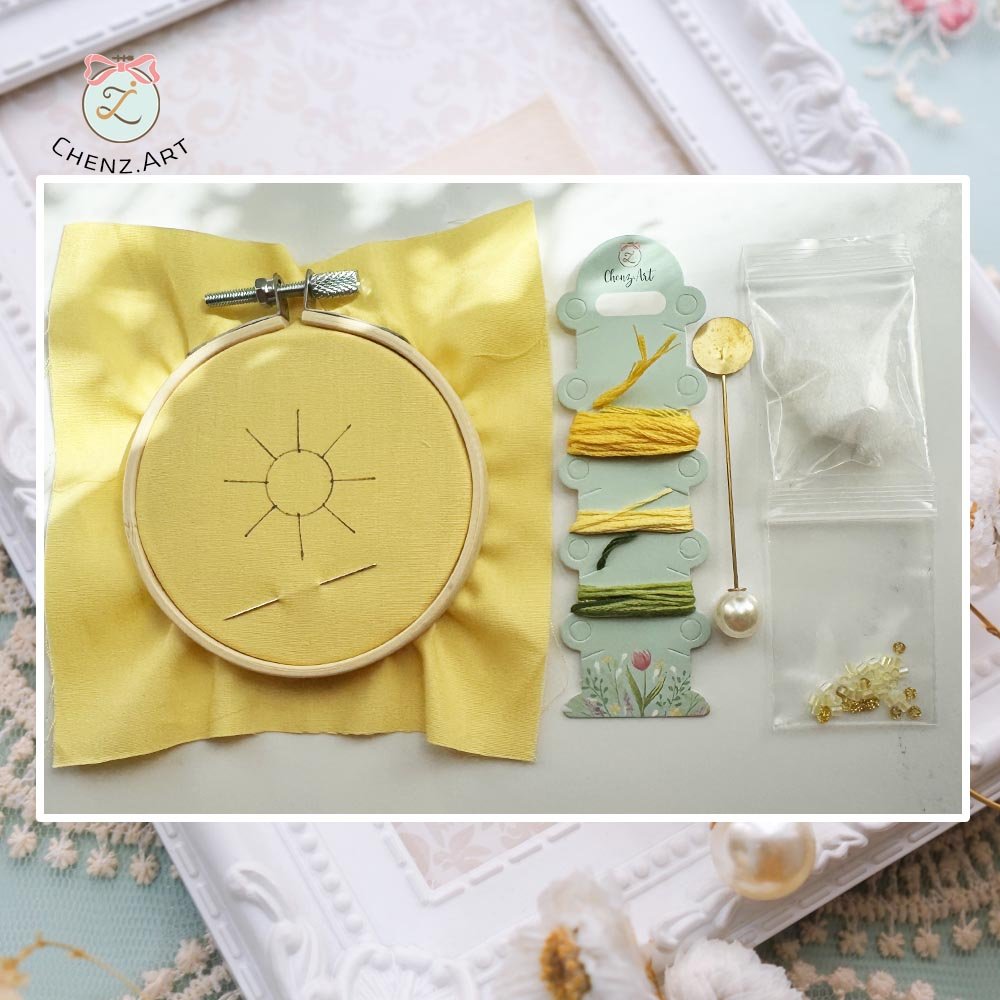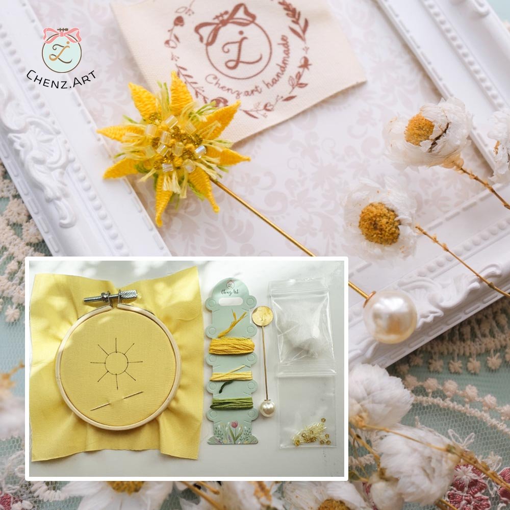 Embroidery kit for the Arfaj brooch, containing the tools used to make an Arfaj flower brooch.