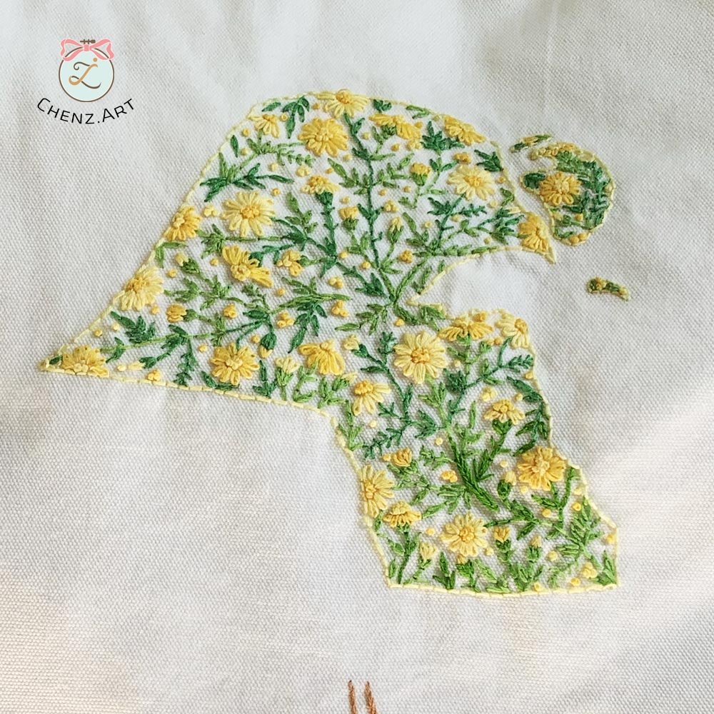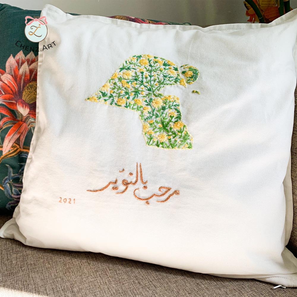 Daisy flower hand embroidery stitches inside Kuwait’s map, simple project for beginners.