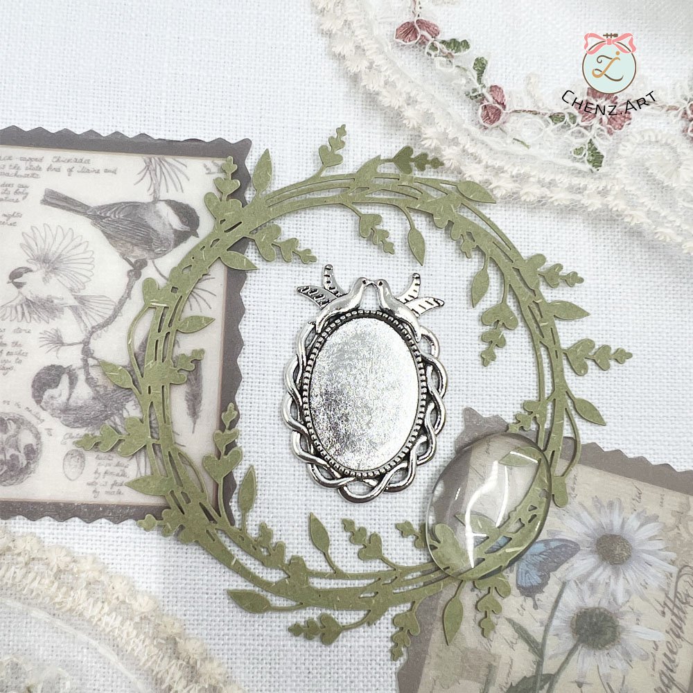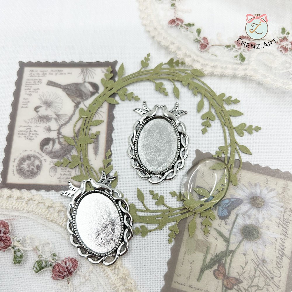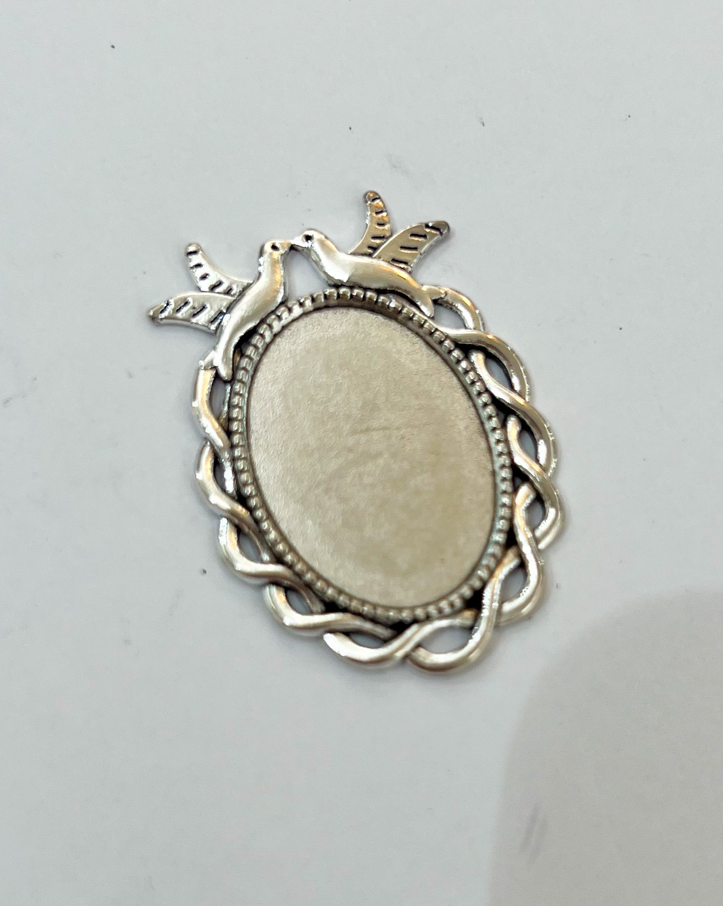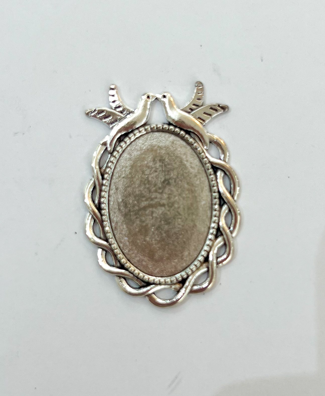 Oval, Silver Metallic Pendant. Two Birds Whipped Frame Design, Includes the piece that is added under the embroidery (embroidery area 18 X 25 mm)